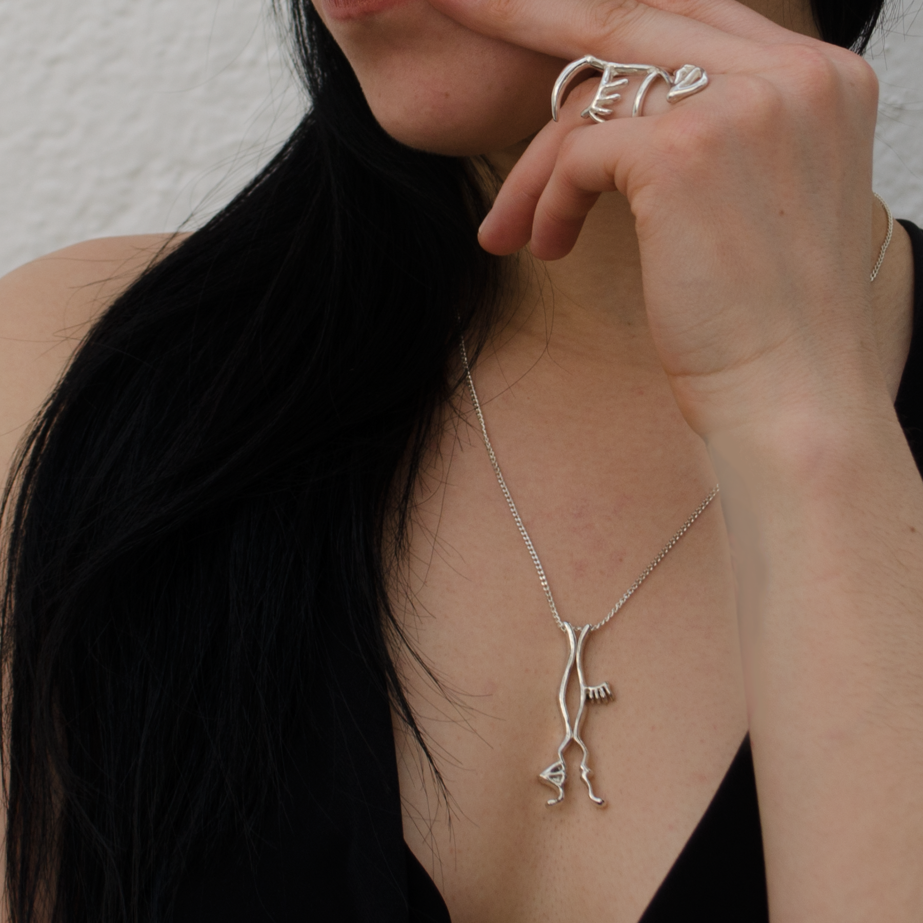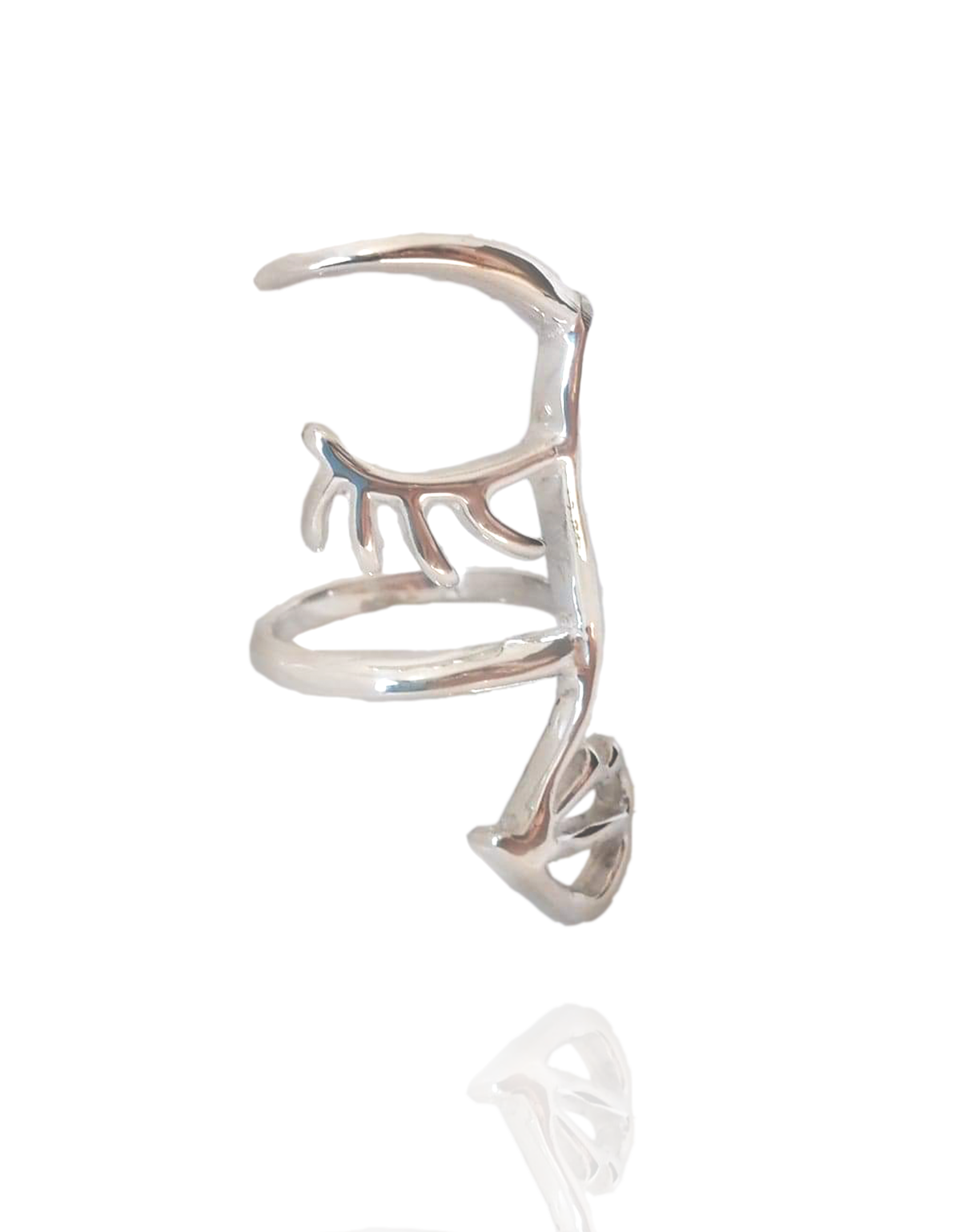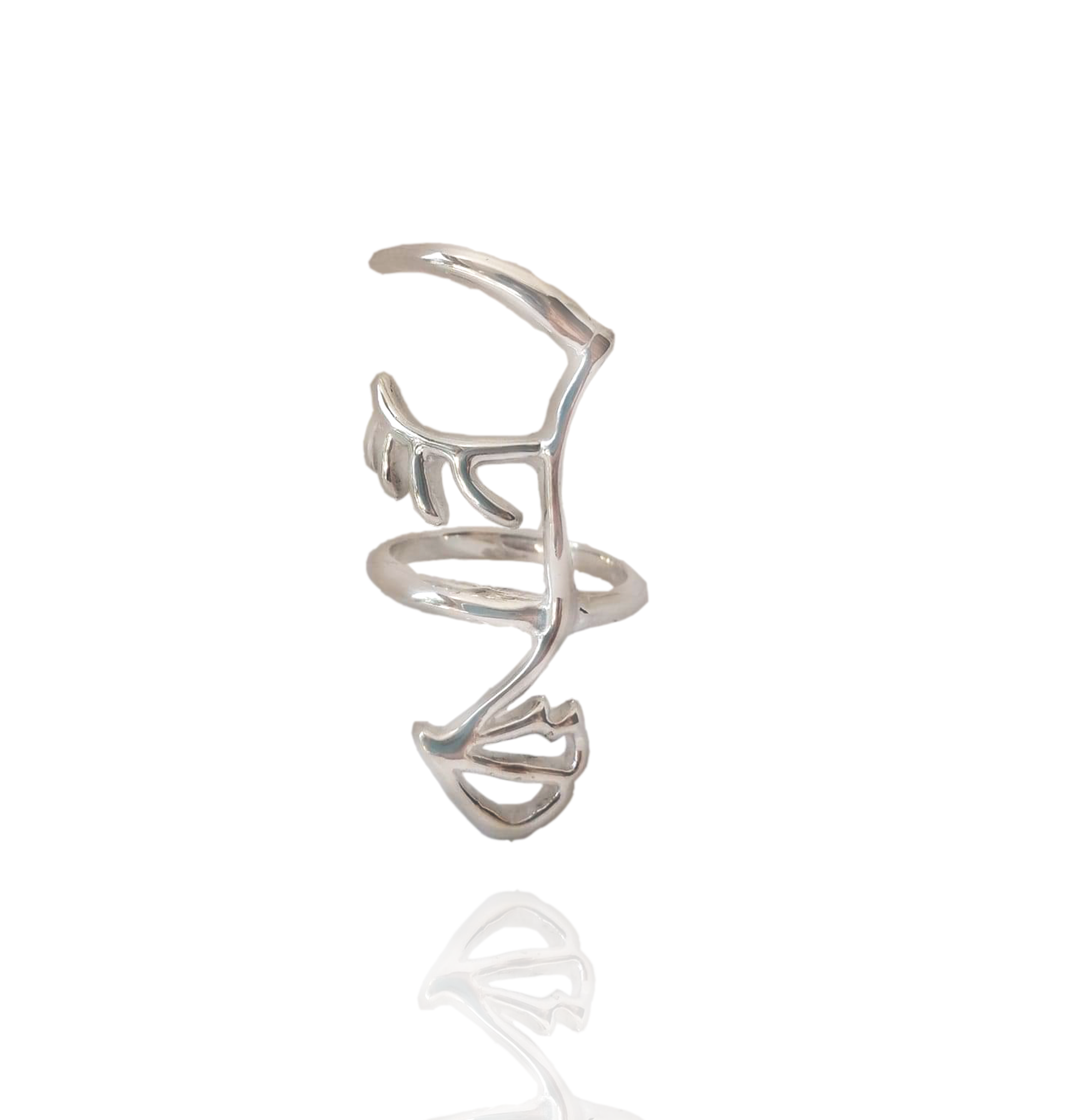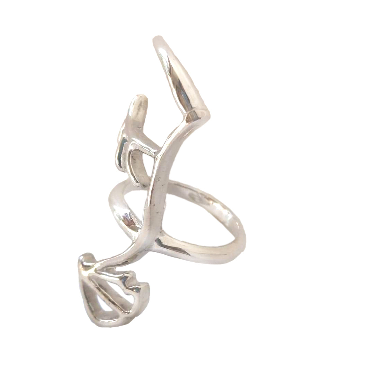 Anillo de plata de perfil abstracto. Se puede usar en todos los dedos, esta diseñado para que puedas doblar los dedos sin que te estorbe el anillo.